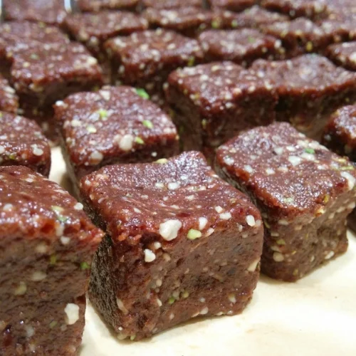 - Shape portions of the mixture into 2 x 2cm cubes. Alternatively, you can make balls. Place each separately on a plate. You should make approximately 40 bites.